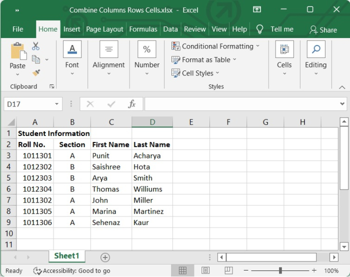 在我們的示例中,我們在 Excel 表格中有一些學生的資訊,例如學號、班級、名字和姓氏。請參見下圖。