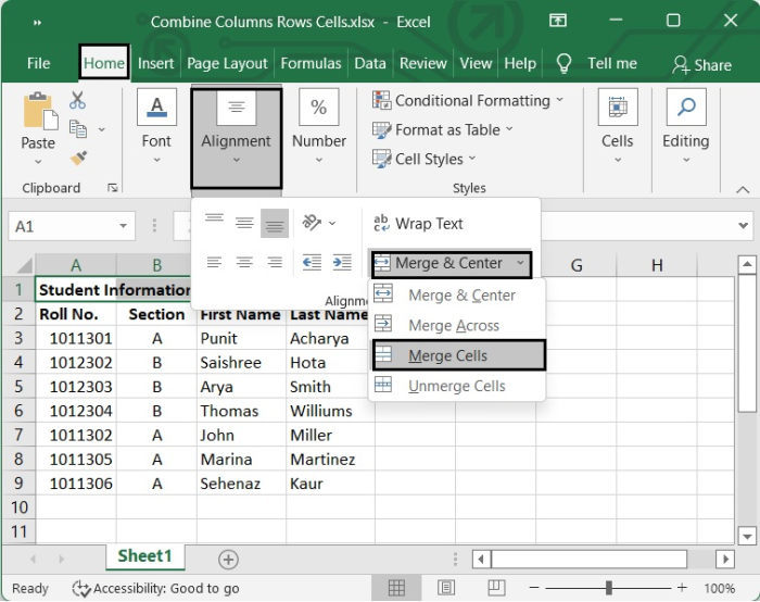 選擇要合併的單元格。在我們的例子中,我們選擇了從 A1 到 D1 的單元格。然後轉到開始 > 對齊方式 > 合併居中。從下拉列表中,選擇合併單元格。