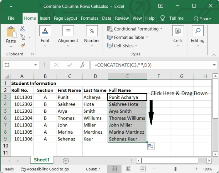 在上面給出的示例中,我們有學生的姓名和姓氏。我們希望將姓名合併到一列中。為此,請選擇一個要寫入合併列資料的空白單元格,並編寫以下公式。在我們的例子中,我們選擇了 E3。