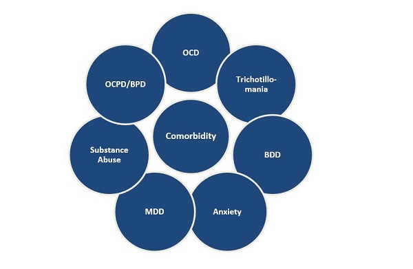 合併症包括強迫症(OCD)。患有皮膚剝脫症的患者也可能對清潔、美麗和完美無瑕的皮膚著迷。其他合併症包括拔毛癖(38%)、軀體變形障礙(27%-45%)、焦慮症(23%-56%)、重度抑鬱症(32%-58%)和物質依賴(38%)。一些研究還發現,患有皮膚剝脫症的患者與人格障礙有關,特別是強迫性和邊緣性人格障礙(71%)。