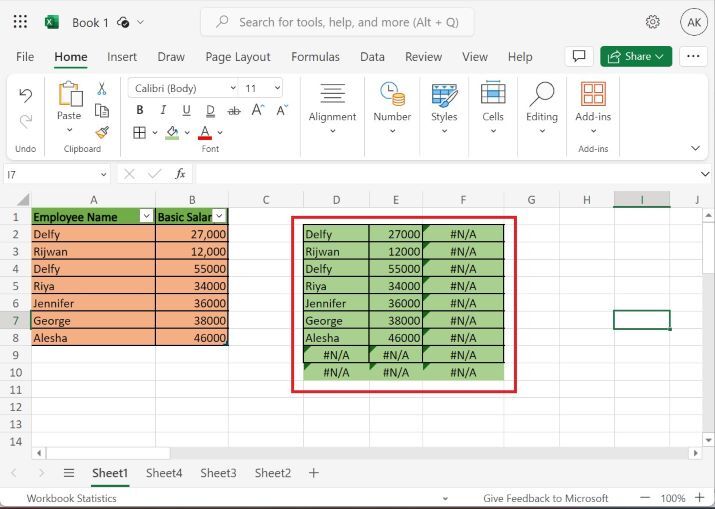 在Excel 365中,將指標定位在單元格E1,並將公式更改為`=EXPAND(Table2,9,3,"blank")`以移除F列中的錯誤。使用者必須展開想要顯示為空白單元格的文字的資料以及選定的範圍。然後按“回車”鍵,將顯示結果,顯示空白文字,如下所示。
