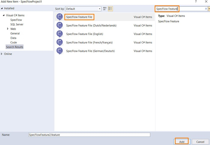 彈出新建專案對話方塊。在搜尋框中輸入SpecFlow功能。從搜尋結果中選擇SpecFlow功能檔案選項。點選新增並繼續。