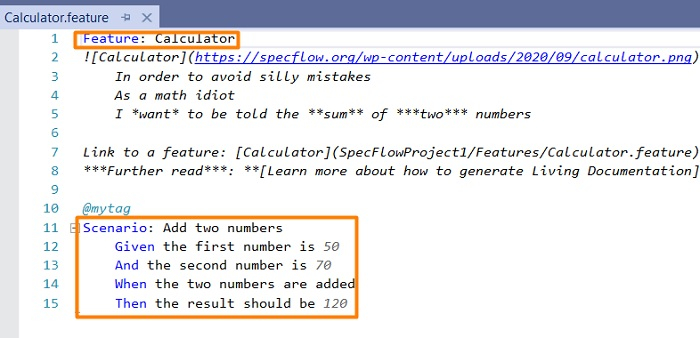 SpecFlow預設生成具有幾個步驟的功能檔案。