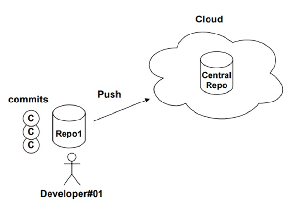 開發人員#01 將儲存庫克隆到他的本地機器,透過執行多個提交來處理專案,並將更改透過推送更改到中央儲存庫來共享,如下所示。
