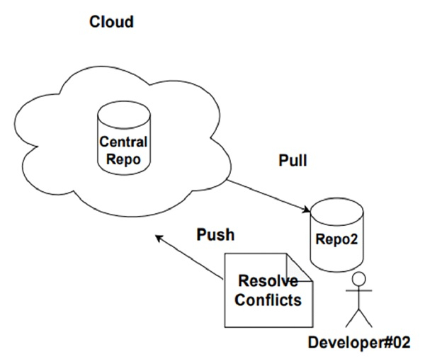 當開發人員#02 需要檢視開發人員#01 所做的更改時,他將從中央儲存庫拉取更改,解決任何現有的衝突並將更改推回中央儲存庫。