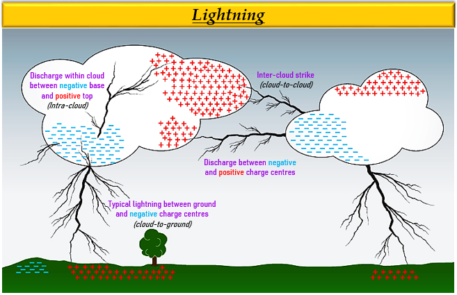 在雷暴期間,氣流向上移動,水滴向下移動,由於它們的劇烈運動,雲中電荷分離。由於這個過程,雲的上部積聚正電荷,而下部積聚負電荷。隨著電荷的積累,其數量變得非常大,然後這些電荷開始透過空氣中的水滴(充當導體)流向雲的負電荷或正電荷區域。因此,這種放電可以以巨大的閃電火花形式出現。