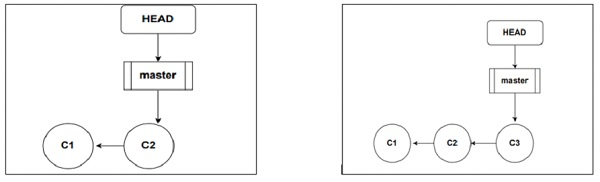 commit 命令會隱式地移動分支的 HEAD 指標。下圖顯示,最初 HEAD 指向提交 c1。每次提交操作後,HEAD 指標都會移動到新的提交。我們可以使用 HEAD 指標或提交雜湊值執行重置。