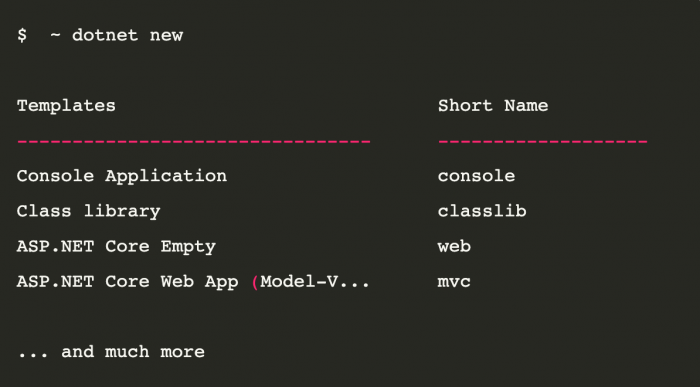 要檢視所有可用的生成器,請在終端中執行 dotnet new 命令。您應該會看到以下輸出。