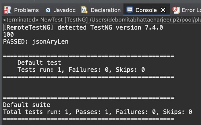 import static io.restassured.RestAssured.given; import org.testng.annotations.Test; import io.restassured.RestAssured; import io.restassured.path.json.JsonPath; import io.restassured.response.Response; public class NewTest { @Test public void jsonAryLen() { //obtain Response from GET request Response res = given() .when() .get("https://jsonplaceholder.typicode.com/posts"); //convert JSON to string JsonPath j = new JsonPath(res.asString()); //length of JSON array int s = j.getInt("data.size()"); System.out.println( s); } }