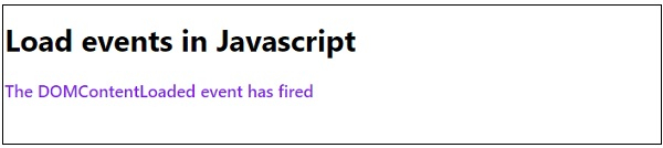 <!DOCTYPE html> <html lang="en"> <head> <meta charset="UTF-8" /> <meta name="viewport" content="width=device-width, initial-scale=1.0" /> <title>Document</title> <style> body { font-family: "Segoe UI", Tahoma, Geneva, Verdana, sans-serif; } .result { font-size: 18px; color: blueviolet; font-weight: 500; } </style> </head> <body> <h1>Load events in Javascript</h1> <div class="result"></div> <script> let resEle = document.querySelector(".result"); document.addEventListener("DOMContentLoaded", () => { resEle.innerHTML = "The DOMContentLoaded event has fired <br>"; }); </script> </body> </html>
