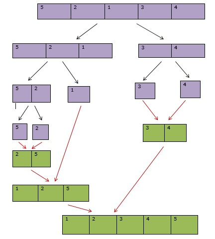 歸併排序是一種遵循分而治之正規化的演算法。它不斷地將陣列分成兩半。然後,它開始對每個元素都為一個元素的列表進行排序,並不斷合併已排序的列表以形成完整排序的列表。