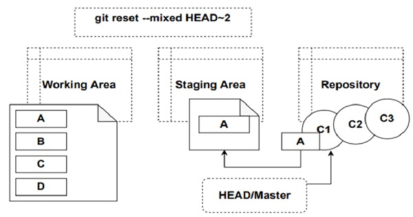$ git reset --mixed HEAD~2 Unstaged changes after reset: M File1.txt $ dell@DESKTOP-N961NR5 MINGW64 /e/tut_repo (master) $ git status -s M File1.txt $ dell@DESKTOP-N961NR5 MINGW64 /e/tut_repo (master) $ cat File1.txt A B c D $ git diff diff --git a/File1.txt b/File1.txt index f70f10e..b9b94a9 100644 --- a/File1.txt +++ b/File1.txt @@ -1 +1,4 @@ A +B +c +D