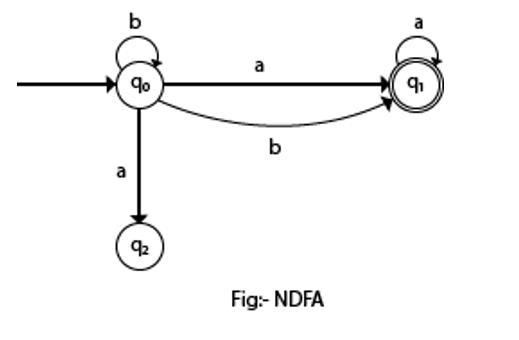 在上面的 NFA 中,很明顯,存在許多從當前狀態到下一個狀態的特定輸入路徑。(狀態 q0 在輸入“b”時,它會進入 q0 本身和 q1)。