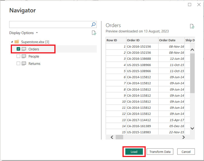 提供的 Excel 表包含三個 Excel 表,但這裡將僅匯入“訂單”表。選擇“訂單”表的勾號,然後單擊“載入”選項。下面提供了相應的快照: