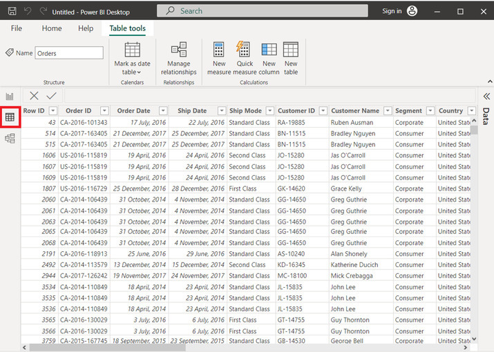 這會將“訂單”表載入到 Power BI 編輯器中。此編輯器在左側窗格中包含三個主要檢視。單擊第二個突出顯示的檢視,即資料檢視。此檢視將匯入的資料值顯示為表格。下面提供了供使用者參考的快照: