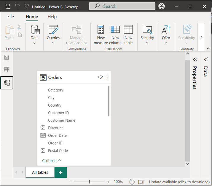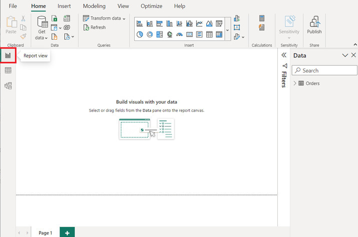 在此檢視中,使用者還可以使用名為 DAX(資料分析表示式)的語言建立計算列、度量和 KPI。單擊左側窗格的第一個選項,如下所示。這將開啟報表的檢視。在此檢視中,使用者可以正確插入任何所需的視覺化效果。