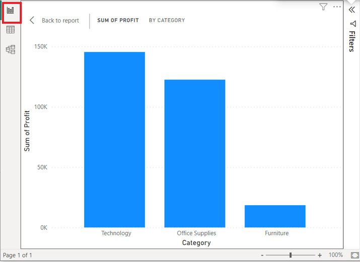 請注意,報表檢視包含所需的視覺化效果,例如堆疊圖表等等。為了更精確地闡明該語句,讓我們考慮下面提供的堆疊柱狀圖示例。對於類別和利潤,我們將瞭解在後續教程中開發相同內容的過程。相應的快照附在下面: