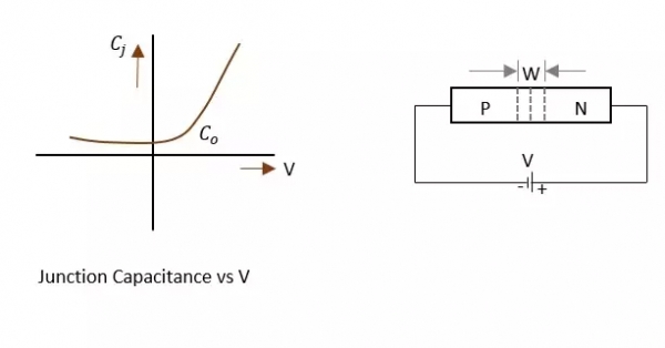 結電容取決於施加的電壓和結的設計。如果結反向偏置,則移動載流子會耗盡結,從而產生一定的電容,其中二極體表現為電容器,結充當電介質。電容隨著反向偏置的增加而減小。