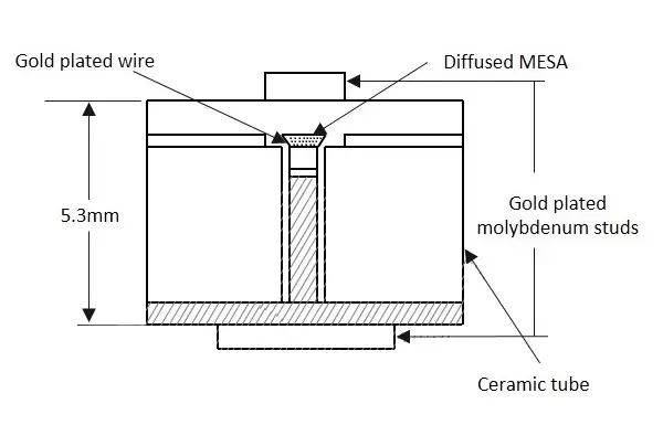 二極體的封裝包含連線到半導體晶片上的電極引線和連線到陶瓷外殼上的引線。下圖顯示了微波變容二極體的外觀。