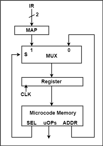它包含總共九個狀態,每個狀態由一條微指令表示。選擇它們所需的最小位數是 4,這是絕對地址的大小。對映硬體也生成相同大小的地址,其輸出也是 4 位寬。這與多路複用器的輸出(輸入到暫存器)和暫存器的輸出(輸入到微程式碼儲存器的地址輸入)相同大小。