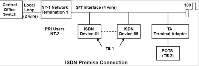 在基本速率介面(BRI)的情況下,網路終端1(NT-1)裝置將2線模擬線路轉換為4線系統,稱為S/T介面。S/T通訊是匯流排拓撲結構,以100歐姆終端結束。NT-2裝置將T介面轉換為S介面。NT-2裝置與終端裝置通訊。