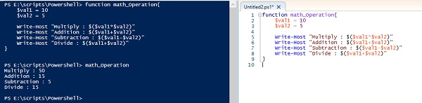 function math_Operation{ $val1 = 10 $val2 = 5 Write-Host "Multiply : $($val1*$val2)" Write-Host "Addition : $($val1+$val2)" Write-Host "Subtraction : $($val1-$val2)" Write-Host "Divide : $($val1+$val2)" } math_Operation