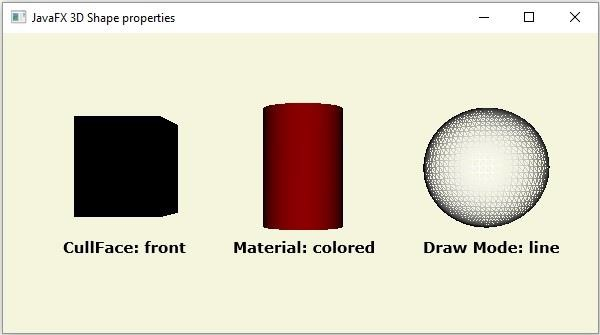 import javafx.application.Application; import javafx.scene.Group; import javafx.scene.PerspectiveCamera; import javafx.scene.Scene; import javafx.scene.paint.Color; import javafx.scene.paint.PhongMaterial; import javafx.stage.Stage; import javafx.scene.shape.Box; import javafx.scene.shape.CullFace; import javafx.scene.shape.Cylinder; import javafx.scene.shape.DrawMode; import javafx.scene.shape.Sphere; import javafx.scene.text.Font; import javafx.scene.text.FontPosture; import javafx.scene.text.FontWeight; import javafx.scene.text.Text; public class JavaFX3DShapesProperties extends Application { public void start(Stage stage) { //Drawing a Box Box cube = new Box(100, 120, 100); cube.setTranslateX(30.0); cube.setTranslateY(180.0); cube.setTranslateZ(150.0); //Setting the property "cull face" cube.setCullFace(CullFace.FRONT); //Drawing a Cylinder Cylinder cylinder = new Cylinder(50, 150); //Setting the properties of the cylinder cylinder.setTranslateX(250.0); cylinder.setTranslateY(180.0); cylinder.setTranslateZ(150.0); //Setting the cull face "material" PhongMaterial material = new PhongMaterial(); material.setDiffuseColor(Color.DARKRED); cylinder.setMaterial(material); //Drawing a Sphere Sphere sphere = new Sphere(75); sphere.setTranslateX(480.0); sphere.setTranslateY(180.0); sphere.setTranslateZ(150.0); //Setting the property "draw mode" sphere.setDrawMode(DrawMode.LINE); //Setting the perspective camera PerspectiveCamera cam = new PerspectiveCamera(); cam.setTranslateX(-50); cam.setTranslateY(50); cam.setTranslateZ(0); Font font = Font.font("verdana", FontWeight.BOLD, FontPosture.REGULAR, 15); Text label1 = new Text("CullFace: front"); label1.setFont(font); label1.setX(10); label1.setY(270); Text label2 = new Text("Material: colored"); label2.setFont(font); label2.setX(180); label2.setY(270); Text label3 = new Text("Draw Mode: line"); label3.setFont(font); label3.setX(370); label3.setY(270); //Setting the Scene Group root = new Group(cube, cylinder, sphere, label1, label2, label3); Scene scene = new Scene(root, 595, 300, Color.BEIGE); scene.setCamera(cam); stage.setTitle("JavaFX 3D Shape properties"); stage.setScene(scene); stage.show(); } public static void main(String args[]){ launch(args); } }