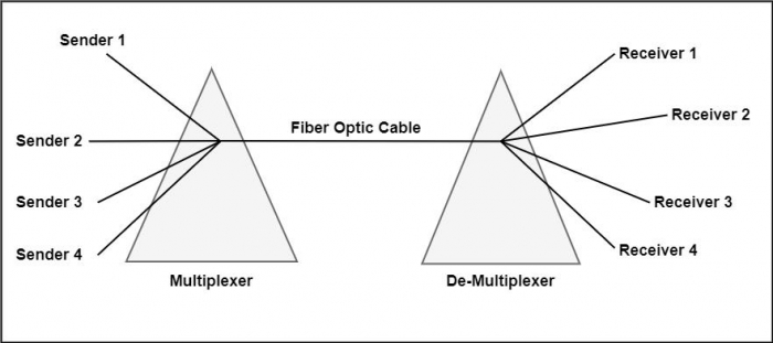 在接收端,混合光被分解成不同的光波,並將其傳遞到相應的接收器,如下面的圖所示。WDM 和頻分複用 (FDM) 的概念相同。