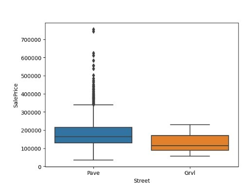 import seaborn as sns import matplotlib.pyplot as plt %matplotlib inline data = pd.read_csv("/content/train.csv") sns.boxplot(data = data, x='Street', y='SalePrice')