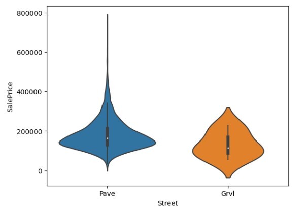 import seaborn as sns import matplotlib.pyplot as plt %matplotlib inline data = pd.read_csv("/content/train.csv") sns.violinplot(data = data, x='Street', y='SalePrice')