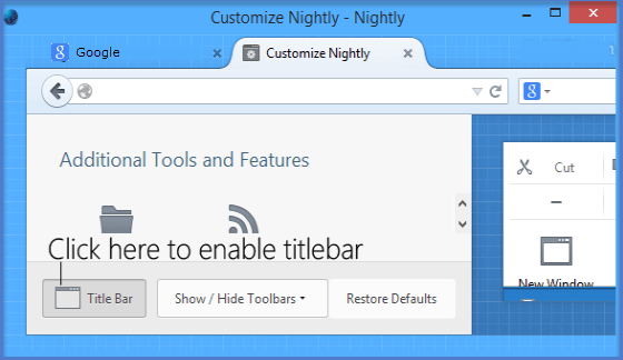 夜間版、UX 版或 Aurora 版是 Firefox Australis UI 的一部分,使用其中任何一個版本的使用者都可以啟用標題欄文字和圖示。請按照以下步驟啟用標題欄文字和圖示。