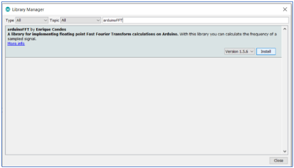 有幾個可用的庫可以幫助您在 Arduino 上計算快速傅立葉變換 (FFT)。我們將研究 **arduinoFFT** 庫。此庫可以透過庫管理器安裝(搜尋 **arduinoFFT**)。