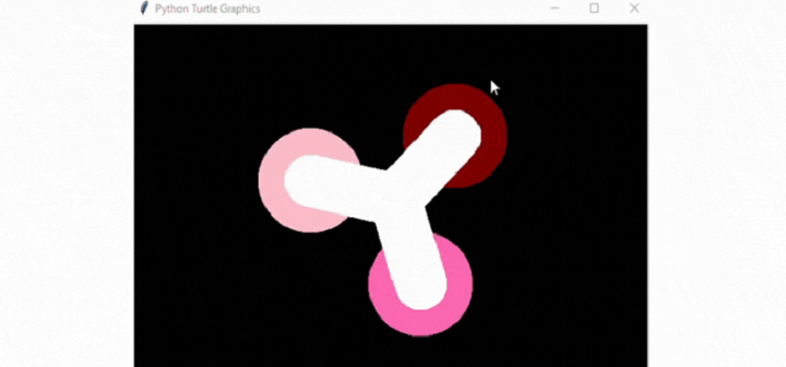 然後,對於視窗,我們定義一個黑色背景。然後,為了將游標返回到其原始狀態,我們將tracer定義為“False”。然後,對於指尖陀螺的翼,我們定義指尖陀螺的翼及其顏色。然後我們將加速熱鍵定義為空格鍵。然後我們執行所有函式以檢視輸出。