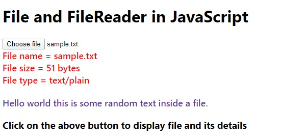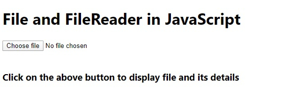 以下是顯示 JavaScript 中檔案和 fileReader 的程式碼 −