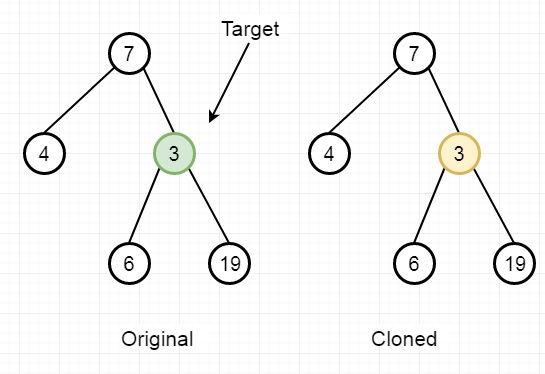 假設我們有兩個二叉樹 original 和 cloned,並且給定原始樹中節點 target 的引用。克隆樹實際上是原始樹的副本。我們必須找到克隆樹中相同節點的引用。