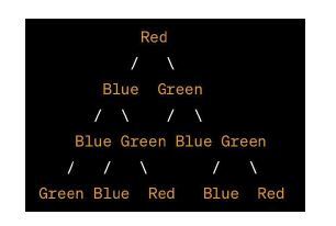 在這個二叉樹的特定圖示中,每個節點都以不同的顏色著色。紅色表示根節點,藍色表示左子節點,綠色表示右子節點。當我們向下遍歷樹時,每個左子節點的顏色從藍色變為綠色,每個右子節點的顏色從綠色變為藍色。
