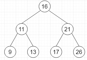TreeNode* root = new TreeNode(16); root->left = new TreeNode(11); root->right = new TreeNode(21); root->left->left = new TreeNode(9); root->left->right = new TreeNode(13); root->right->left = new TreeNode(17); root->right->right = new TreeNode(26);