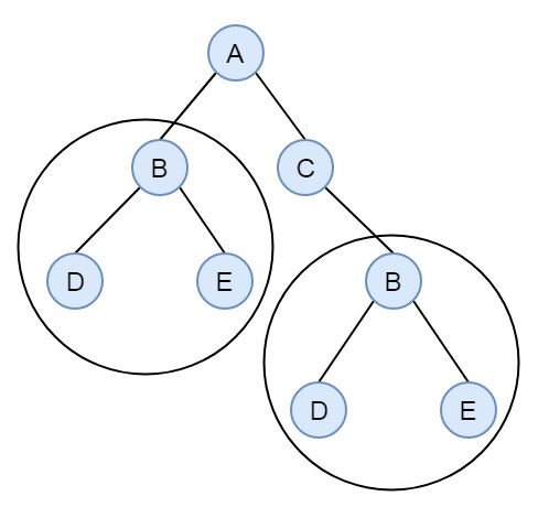 有兩個大小為 2 的相同子樹。在每個子樹 D 中,BD 和 BE 也是重複的子樹。我們可以透過使用樹序列化和雜湊處理來解決這個問題。我們將在雜湊表中儲存子樹的中序遍歷。我們將為葉節點插入開括號和閉括號。