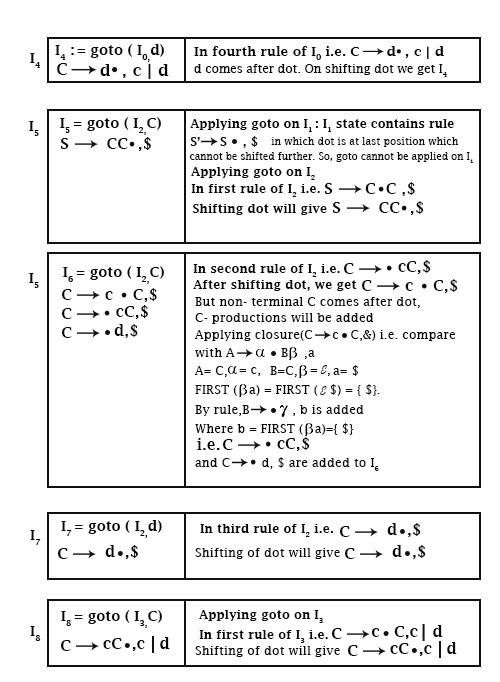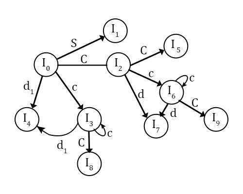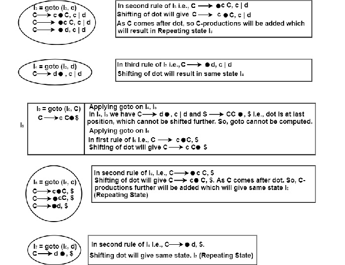 在 I7、I8、I9 中,我們有產生式 C → d ∙,$,c → cC ∙,c | d 和 ∙ C → cC ∙,$,即點無法進一步移動。