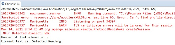 import org.openqa.selenium.By; import org.openqa.selenium.WebDriver; import org.openqa.selenium.WebElement; import org.openqa.selenium.firefox.FirefoxDriver; import java.util.concurrent.TimeUnit; import java.util.List; public class XpathFindElment{ public static void main(String[] args) { System.setProperty("webdriver.gecko.driver", "C:\Users\ghs6kor\Desktop\Java\geckodriver.exe"); WebDriver driver = new FirefoxDriver(); //implicit wait driver.manage().timeouts().implicitlyWait(5, TimeUnit.SECONDS); //URL launch driver.get("https://tutorialspoint.tw/about/about_careers.htm"); // identify elements with findElements xpath List p = driver.findElements(By.xpath("//ul[@class='toc reading']/li")); //count of list of matching elements int s = p.size(); //identify element with xpath WebElement m = driver.findElement(By.xpath("//ul[@class='toc reading']/li[1]")); System.out.println("Element text is: "+ m.getText()); driver.quit(); } }