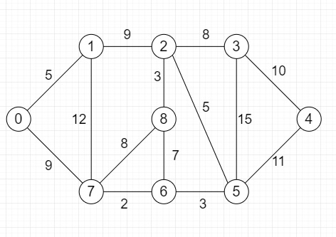 nodes = 9 g = Graph(nodes) g.insert_edge(0, 1, 5) g.insert_edge(0, 7, 9) g.insert_edge(1, 2, 9) g.insert_edge(1, 7, 12) g.insert_edge(2, 3, 8) g.insert_edge(2, 8, 3) g.insert_edge(2, 5, 5) g.insert_edge(3, 4, 10) g.insert_edge(3, 5, 15) g.insert_edge(4, 5, 11) g.insert_edge(5, 6, 3) g.insert_edge(6, 7, 2) g.insert_edge(6, 8, 7) g.insert_edge(7, 8, 8) source = 0 k = 64