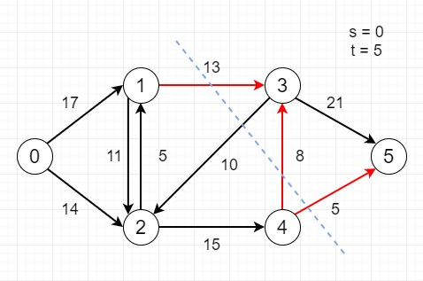 #include <bits/stdc++.h> using namespace std; #define NODES 6 int bfs(int graph[NODES][NODES], int src, int sink, int par[]) { bool vis[NODES]; memset(vis, 0, sizeof(vis)); queue <int> que; que.push(src); vis[src] = true; par[src] = -1; while (!que.empty()) { int u1 = que.front(); que.pop(); for (int v1=0; v1<NODES; v1++){ if (vis[v1]==false && graph[u1][v1] > 0) { que.push(v1); par[v1] = u1; vis[v1] = true; } } } return (vis[sink] == true); } void dfs(int graph[NODES][NODES], int src, bool vis[]) { vis[src] = true; for (int i = 0; i < NODES; i++) if (graph[src][i] && !vis[i]) dfs(graph, i, vis); } void minCut(int graph[NODES][NODES], int src, int sink) { int u, v; int temp_graph[NODES][NODES]; for (u = 0; u < NODES; u++) for (v = 0; v < NODES; v++) temp_graph[u][v] = graph[u][v]; int par[NODES]; while (bfs(temp_graph, src, sink, par)){ int path_flow = INT_MAX; for (v=sink; v!=src; v=par[v]) { u = par[v]; path_flow = min(path_flow, temp_graph[u][v]); } for (v=sink; v != src; v=par[v]) { u = par[v]; temp_graph[u][v] -= path_flow; temp_graph[v][u] += path_flow; } } bool vis[NODES]; memset(vis, false, sizeof(vis)); dfs(temp_graph, src, vis); for (int i = 0; i < NODES; i++) for (int j = 0; j < NODES; j++) if (vis[i] && !vis[j] && graph[i][j]) cout << "("<< i << ", " << j << ")" << endl; return; } int main() { int graph1[NODES][NODES] = { {0, 17, 14, 0, 0, 0}, {0, 0, 11, 13, 0, 0}, {0, 5, 0, 0, 15, 0}, {0, 0, 9, 0, 0, 21}, {0, 0, 0, 8, 0, 5}, {0, 0, 0, 0, 0, 0} }; minCut(graph1, 0, 5); }