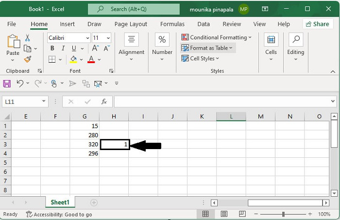 開啟一個 Excel 工作簿,並將數字按照您的意願輸入單元格中。現在在空白單元格中輸入公式 **=GCD(G1:G4)**,如下圖所示。