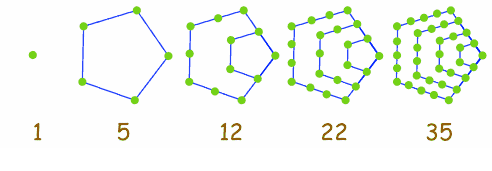 五角錐數等於五角錐底部的物品數量。看看下方的幾個五角數。