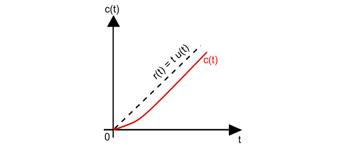 方程(11)顯示了一階系統對單位斜坡輸入的時間響應,對於t的所有正值,c(t)都遵循單位斜坡訊號。但是,與輸入訊號存在τ個單位的偏差。從方程(t)中也可以看出,c(t)既有穩態項也有暫態項。