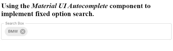 在下面的示例中,我們使用了 Material UI 的 AutoComplete 元件來實現搜尋欄。我們將汽車品牌儲存在陣列中。此外,我們添加了“BMW”作為固定選項。