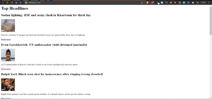 **"@app.route('/')"** 裝飾器指定 Flask 應用程式的 URL 端點。當用戶導航到根 URL 時,將呼叫“news”函式。此函式向 NewsAPI 發出 API 請求,以獲取來自 BBC 新聞源的頭條新聞。它從 API 響應中提取相關資料並將其儲存在單獨的列表中,包括標題、描述、影像 URL 和指向完整文章的 URL 連結。
