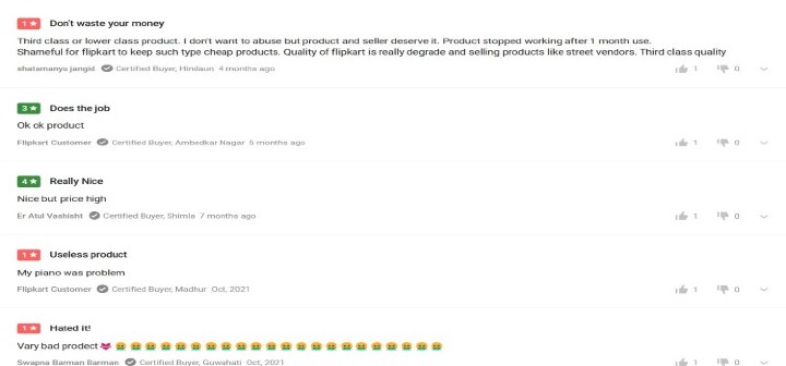 Third class or lower class product I dont want to abuse but product and seller deserve it Product stopped working after 1 month useShameful for flipkart to keep such type cheap products Quality of flipkart is really degrade and selling products like street vendors Third class qualityREAD MORE 0.18333333333333335 Analysis: Negative ==================== Ok ok productREAD MORE 0.5 Analysis: Positive ==================== Nice but price highREAD MORE 0.55 Analysis: Positive ==================== My piano was problemREAD MORE 0.5 Analysis: Positive ==================== Vary bad prodectREAD MORE -0.09999999999999992 Analysis: Negative ====================