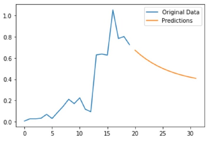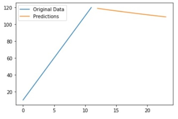 此程式碼隨後將 ARIMA 模型擬合到自定義資料集,對接下來的 12 個時間步長進行預測,並將預測結果儲存在 predictions 變數中。在此示例中,自定義資料集是包含 12 個值的列表,但是對於任何時間序列資料,擬合 ARIMA 模型和進行預測的過程都是相同的。
