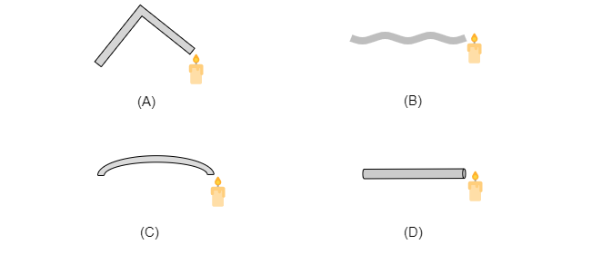 A、B 和 C 透過的管道不是直的。只有 A 透過直的管道,我們知道光只能沿直線傳播。